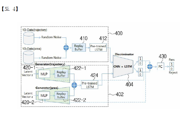 | 본 발명은 신경망 기반 패턴 인증 장치 및 방법을 개시한다. 본 발명에 따르면, 제1 패턴에 대해 사용자가 복수회 입력한 패턴 데이터인 원본 데이터의 특징값을 입력하는 원본 데이터 입력부, 임의의 노이즈를 이용하여 상기 원본 데이터에 대응되는 비교 데이터를 생성하는 비교 데이터 생성부 및 상기 원본 데이터의 특징값과 상기 비교데이터의 특징값을 통해 학습이 수행되어 상기 비교 데이터가 상기 원본 데이터에 근접한 정도에 대한 결과값 및 상기 제1 패턴에 대해 상기 사용자가 입력한 패턴 데이터와 제3자가 입력한 패턴 데이터에 대한 통과 여부를 결정하는 판별부를 포함하되, 상기 비교 데이터 생성부는 상기 판별부의 상기 비교 데이터가 상기 원본 데이터에 근접한 정도에 대한 결과값을 피드백 받아 갱신된 비교 데이터를 생성하는 신경망 기반 패턴 인증 장치가 제공된다. | |