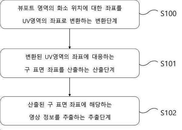 | 특허원문 | 3D 좌표계의 단위 구에 외접한 구의 일부인 uv 곡면을 기반으로 viewport를 추출함. 이때, viewport 평면상의 좌표에 대응하는 uv 곡면상의 좌표에 대해 보정 과정이 수반됨 |
